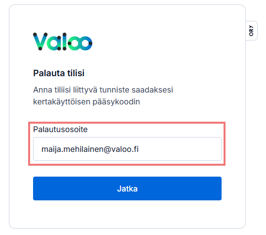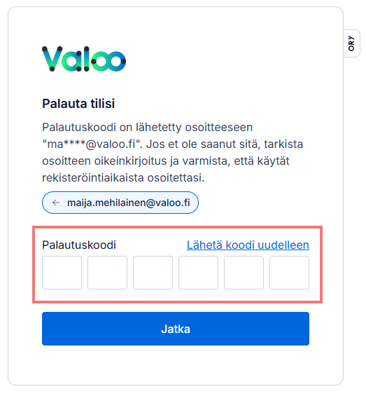 3. Muutaman minuutin päästä saat palautuskoodin sähköpostiisi. Syötä palautuskoodi kenttään ja paina "Jatka".
