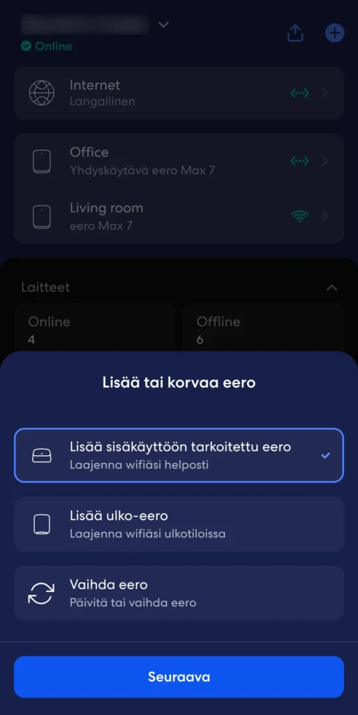 2. Valitse haluamasi eero-laitteen tyyppi ja paina ”Seuraava”. Jatka sovelluksen ohjeiden mukaisesti lisätäksesi uuden reittimen verkkoosi.