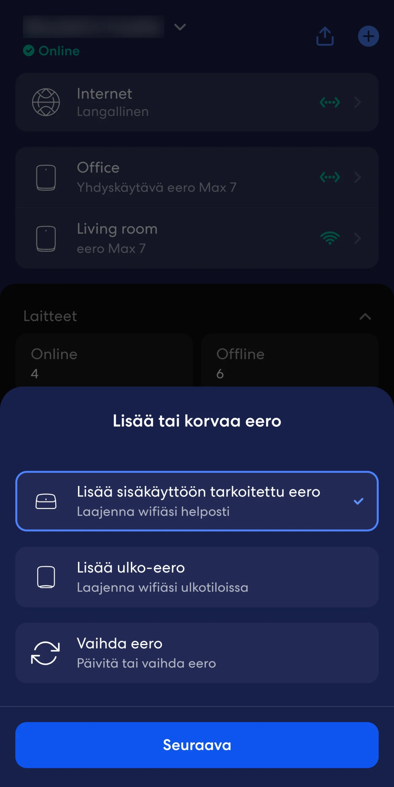 2. Valitse haluamasi eero-laitteen tyyppi ja paina ”Seuraava”. Jatka sovelluksen ohjeiden mukaisesti lisätäksesi uuden reittimen verkkoosi.