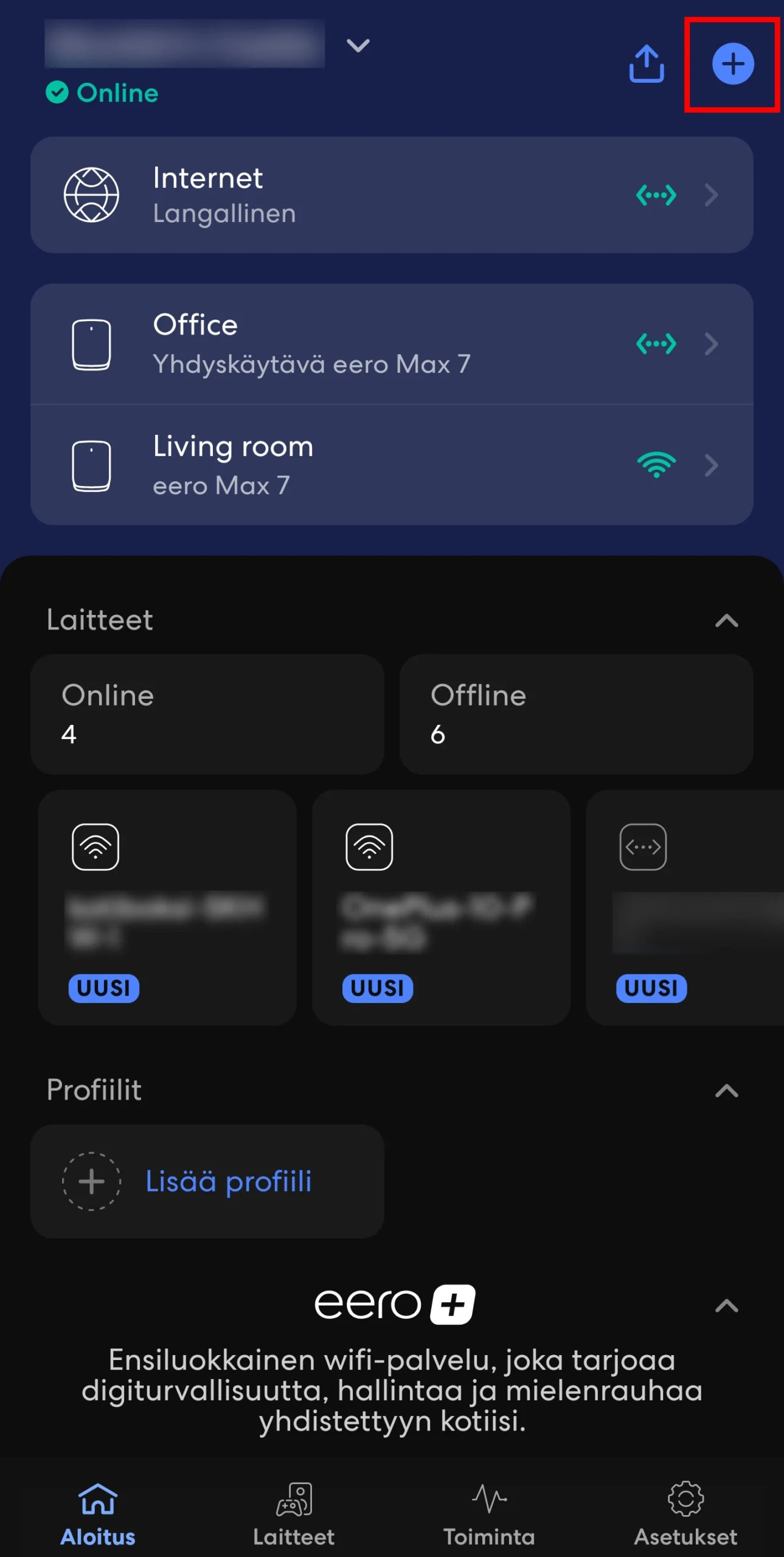 1. Avaa eero-sovellus ja paina oikeassa yläkulmassa olevaa +-näppäintä avataksesi laitteiden lisäysvalikon.