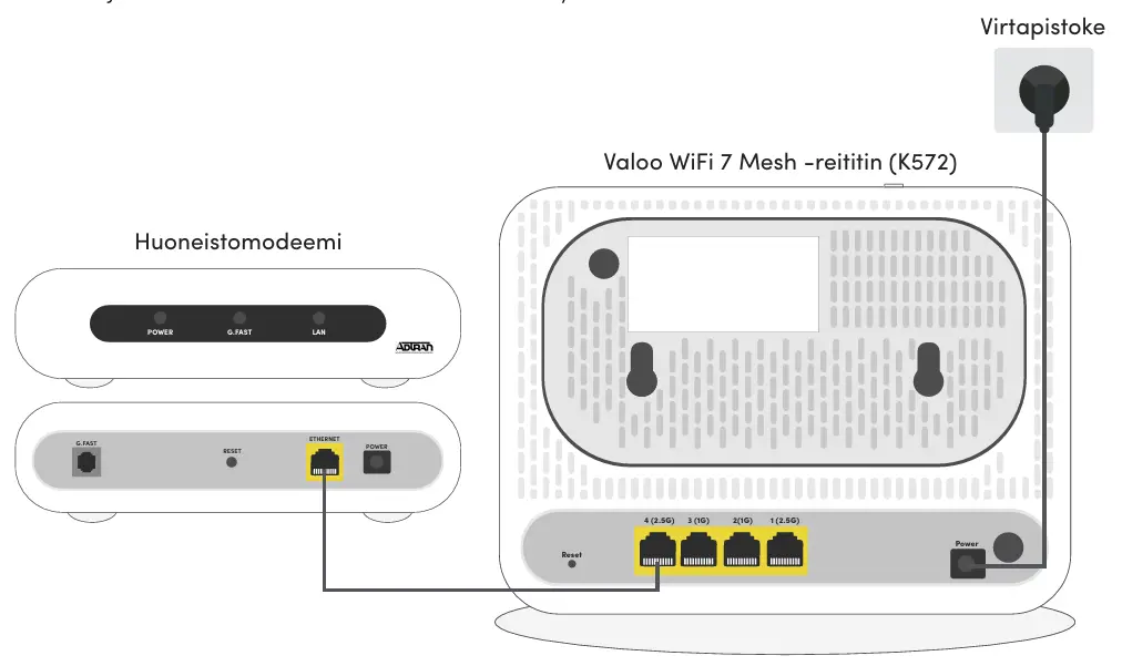 1. Kytke johdot seuraavasti: Virtajohto reitittimestä virtapistokkeeseen. Verkkokaapeli (RJ45) reitittimestä huoneiston modeemin ethernet-liitäntään. Varmista myös, että modeemin virtajohto on kytketty virtapistokkeeseen ja modeemin G.Fast liitäntään kytketty kaapeli on kytketty huoneistosi puhelinpistorasiaan. Reitittimen tulee olla kytkettynä aina modeemin ethernet-liitäntään, jotta nettiyhteys toimii. Jos reitittimen langattoman yhteyden kantavuus huoneistossasi on riittämätön, voit laajentaa verkkoa lisäreitittimillä.